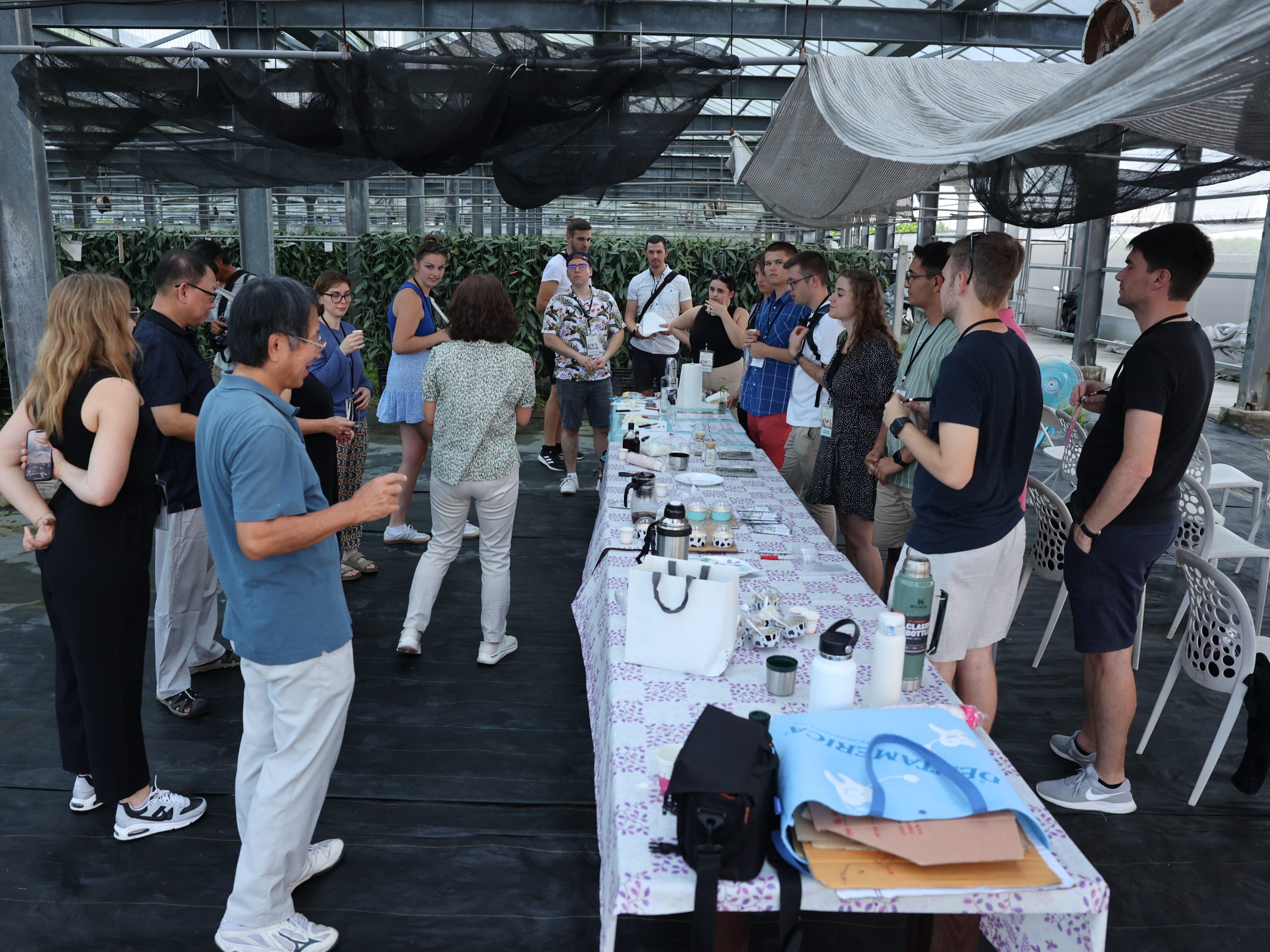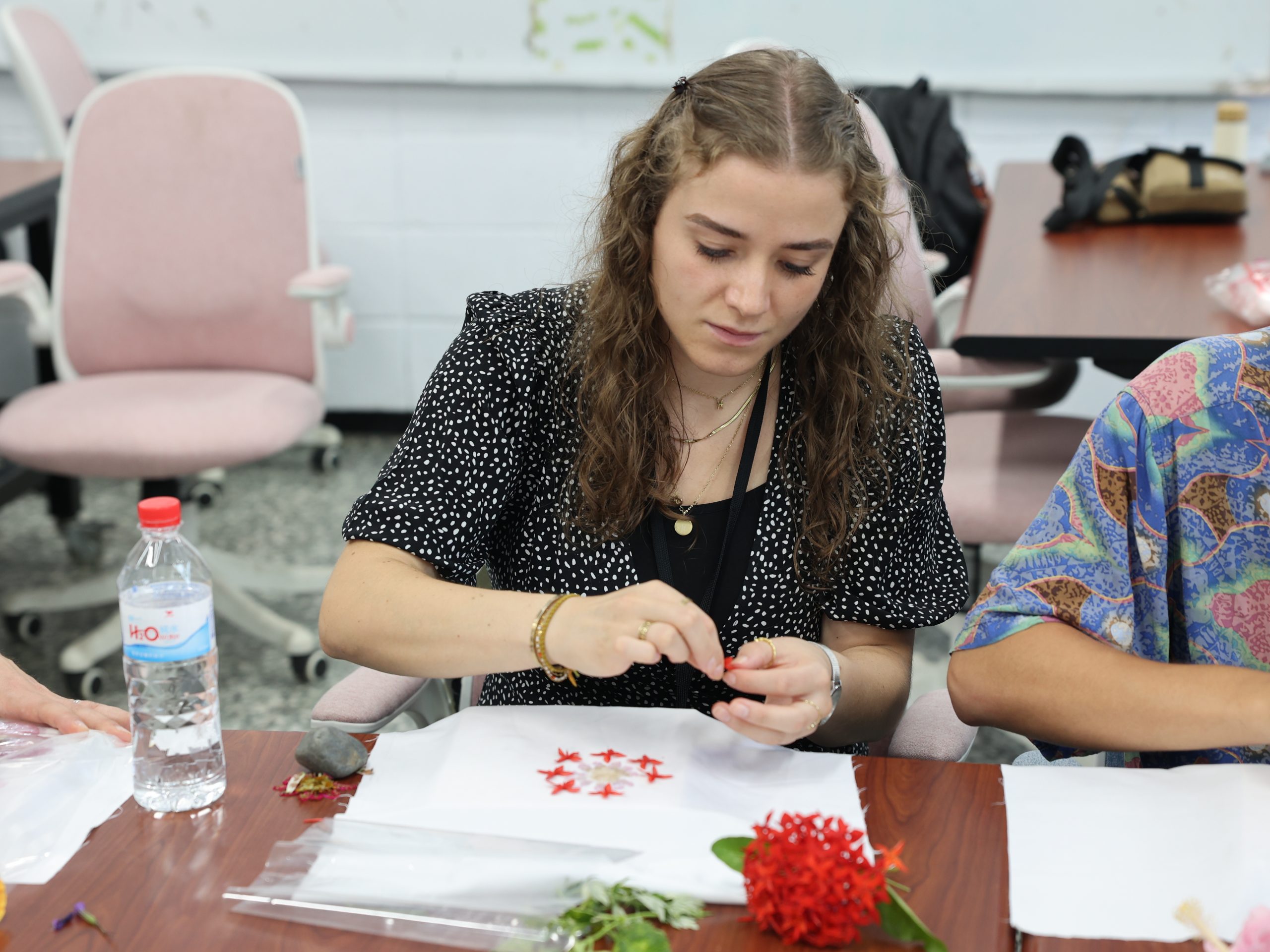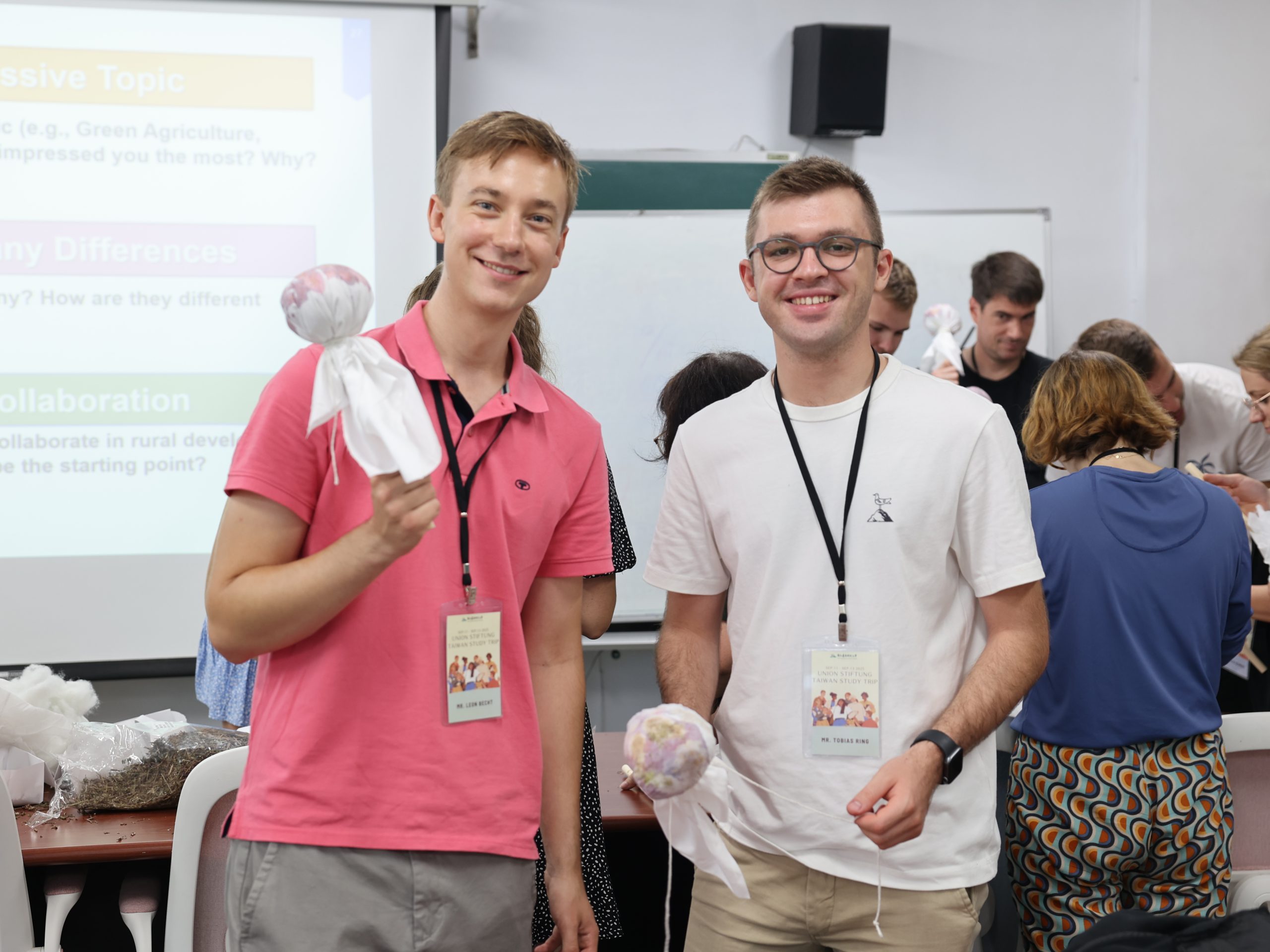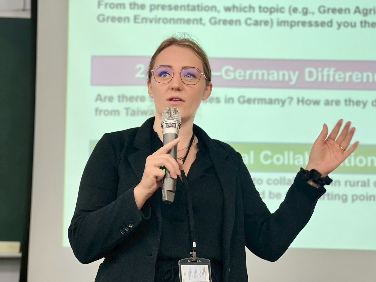 訪團交流行程安排與本校通識教育中心主任簡赫琳教授座談,內容涵蓋台灣政治制度、國際關係及民主發展歷程,現場互動熱烈,學員踴躍提問與老師交流觀點。隨後參訪景觀暨遊憩管理研究所,由所長周宛俞副教授介紹台灣在綠色農業、永續環境與綠色照護的實踐案例,並引導分組討論。學員們比較台、德兩國在農業政策與環境管理之差異,提出結合藝術推廣環境教育的構想,以小組形式上台發表討論成果,呈現學習心得與觀察視角;同時在療癒庭園進行實務體驗,透過花草採摘與植物染 DIY,親手操作感受自然素材價值。