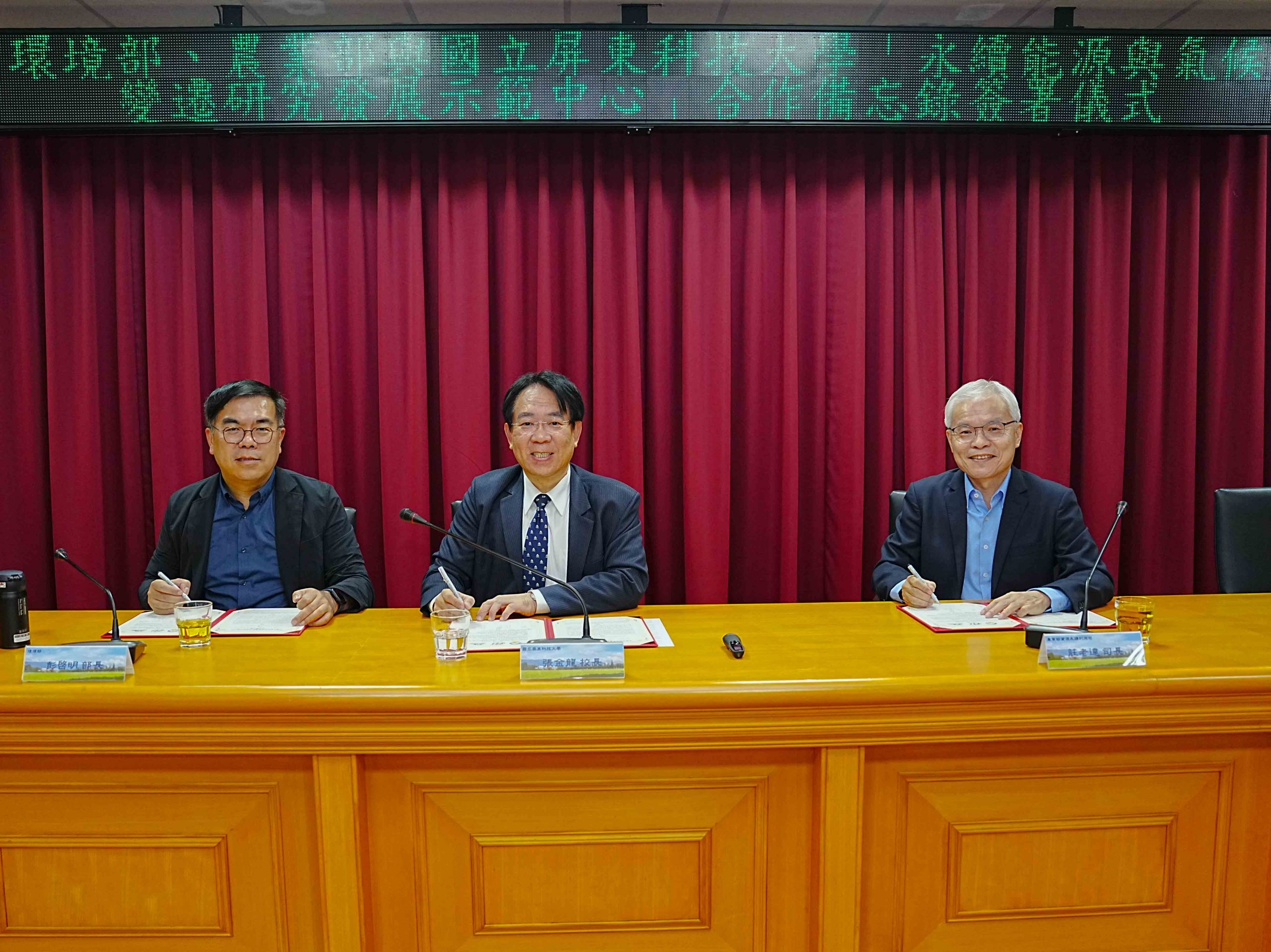 國立屏東科技大學(下稱屏科大)今(26)日與環境部、農業部簽署「永續能源與氣候變遷研究發展示範中心」合作備忘錄(MOU),由環境部彭啓明部長、屏科大張金龍校長及農業部資源永續利用司莊老達司長三方代表簽署。因應我國2050淨零轉型政策,以農業永續、氣候變遷與循環經濟為目標,未來示範中心將透過適當的生質能綠色技術(GreenTech)將畜牧業所產生之糞尿廢棄物資源化處理,以達生物質資源永續利用最大化,創造環境與經濟的永續價值。