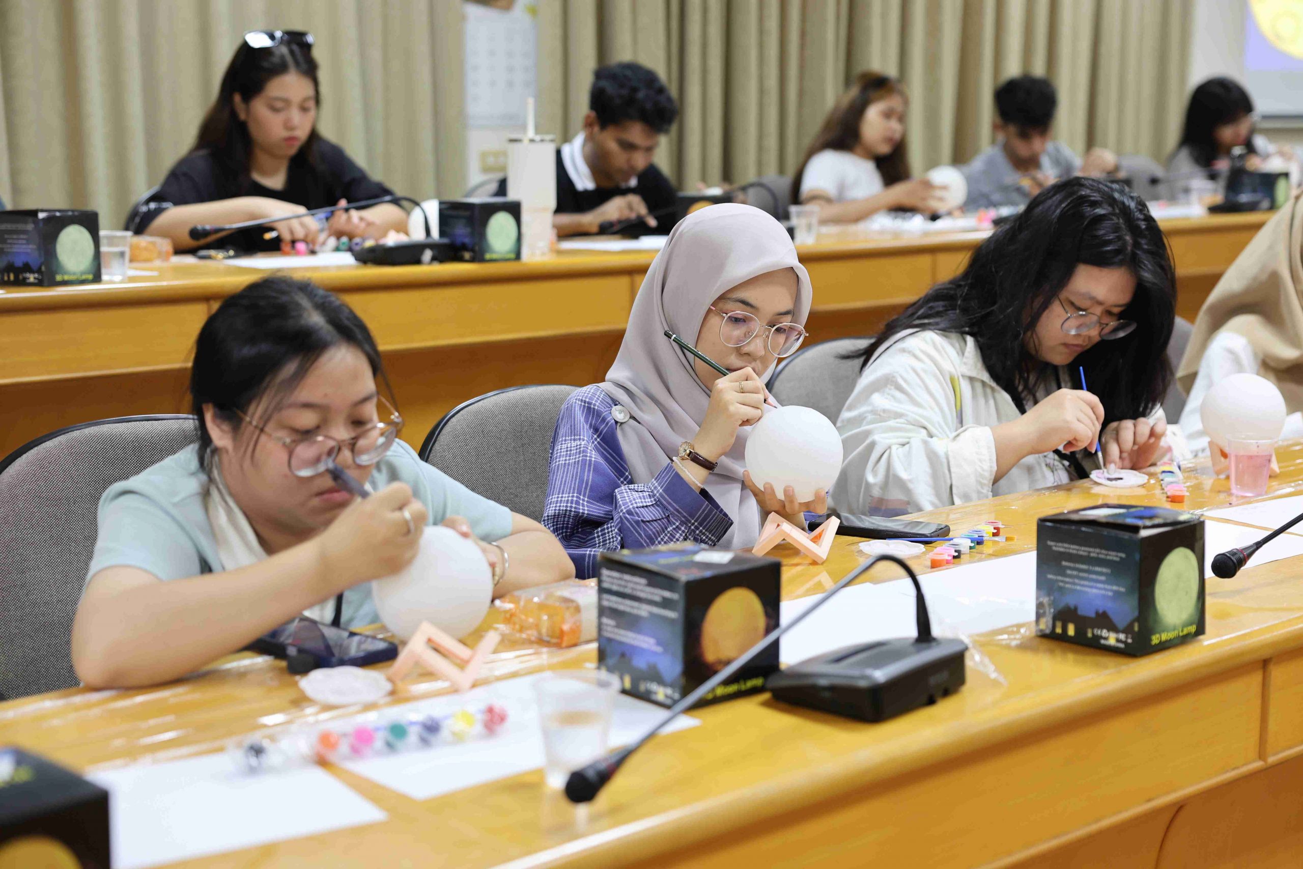 為迎接即將到來的中秋佳節,國際事務處於114年9月22日下午在行政中心三樓第一會議室舉辦「月亮繪說畫」創意月球燈彩繪活動。現場氣氛熱鬧溫馨,吸引來自貝里斯、尼泊爾、印度、泰國、越南、緬甸、印尼、馬來西亞等8國外籍生,以及台灣本地生與教職員齊聚一堂,共享別具特色的文化交流盛會。活動開始藉由介紹嫦娥奔月、吳剛伐桂等中華傳統中秋故事,帶領大家認識中秋的文化意涵。