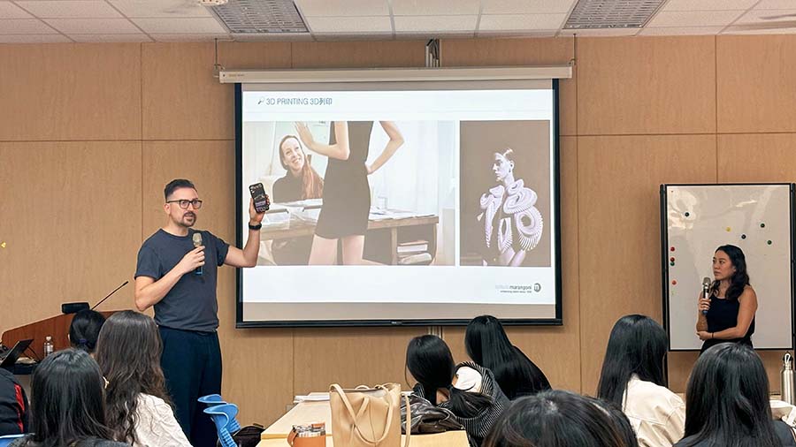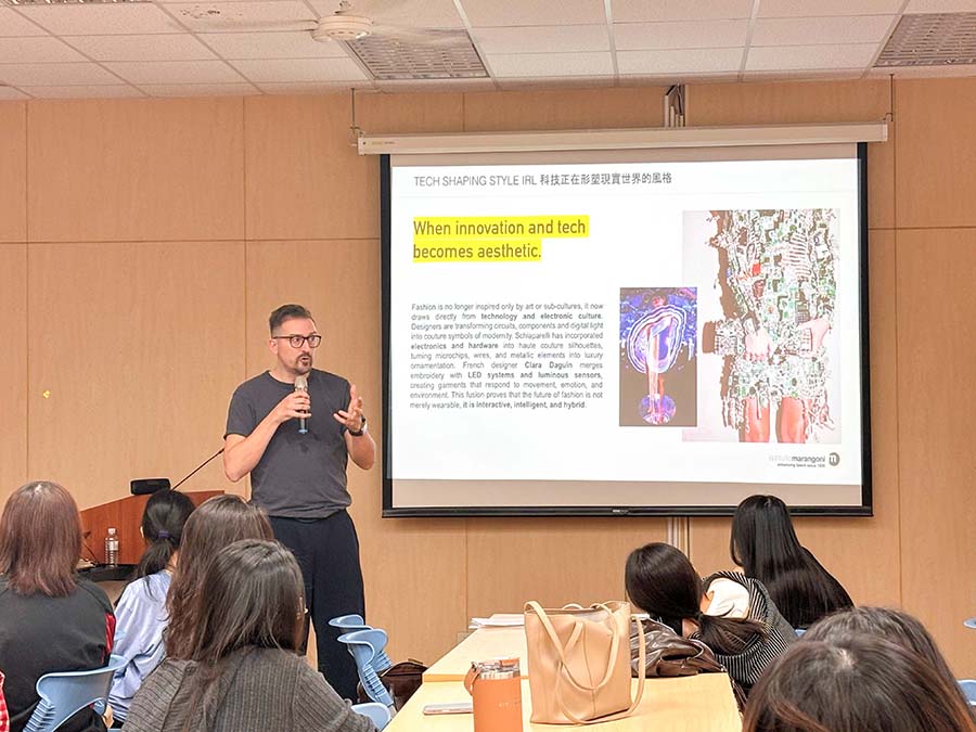 在講座中,Franck Pouchoulin 教授以產業趨勢與創意思維為核心,探討科技如何形塑現實世界的風格與品牌運作方式。他指出,虛擬角色將成為品牌敘事的新語言,而在數位時代中,消費者可同時擁有多重「虛擬分身」與身份,這使品牌必須重新思考如何在不同數位世界中與受眾建立連結。他進一步說明,遊戲思維正改變品牌體驗模式,未來的時尚不僅是產品,更是一種互動與參與的體驗,讓消費者在虛擬與真實之間自由表達自我。