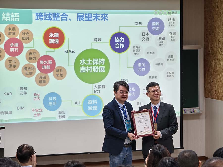 本次活動特別邀請農村發展及水土保持署王晉倫副署長蒞臨,並以 「水土保持及農村發展推動方向」為題發表專題演講。王副署長從政策推動、治理策略到產官學跨域合作等面向,深入解析臺灣當前水土保持與農村發展的重要議題,並高度肯定水土保持系長年在專業人培育、自然解方(NbS) 推動、坡地治理技術研發及社區治理協助等方面的卓著貢猷。