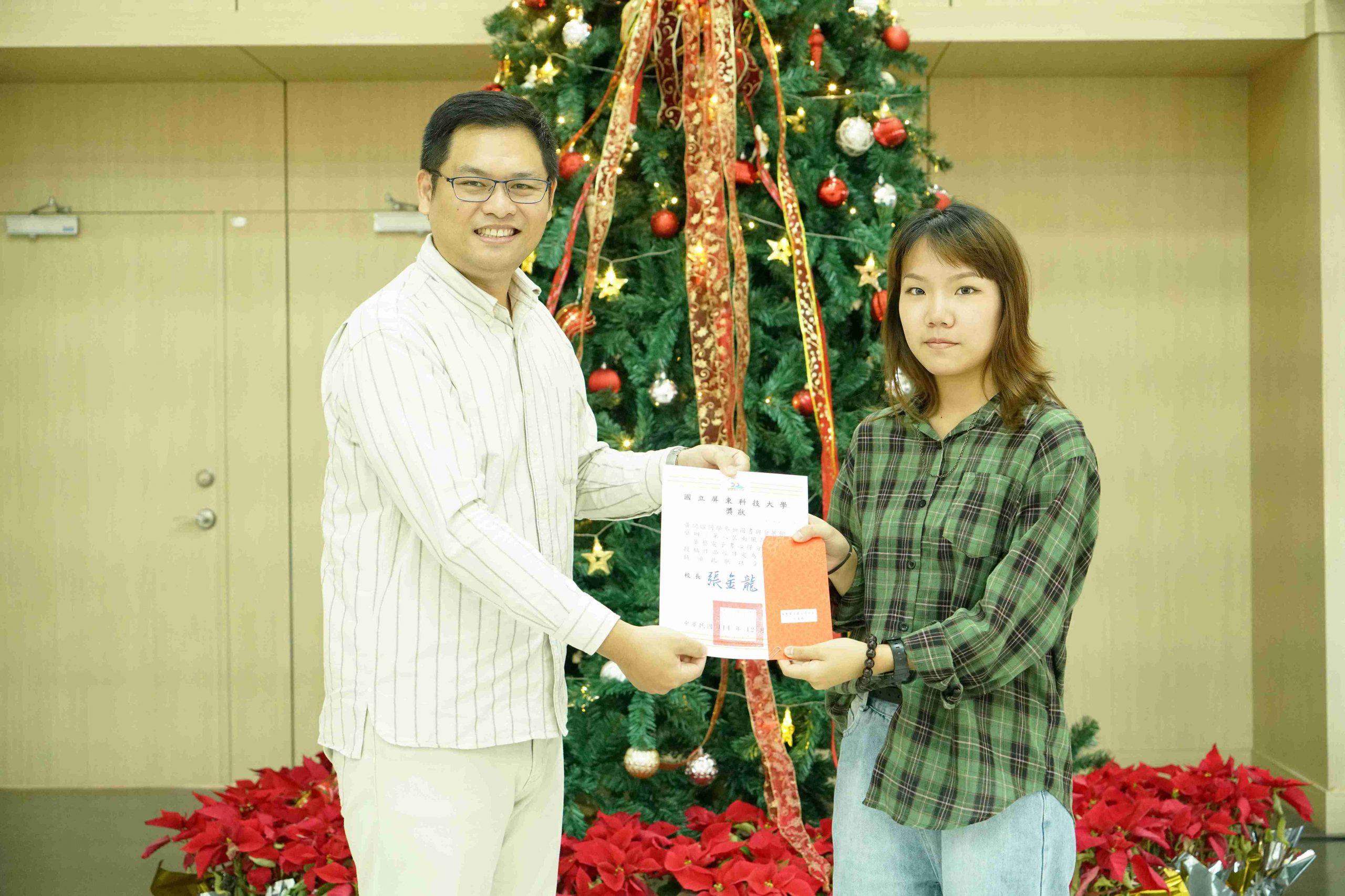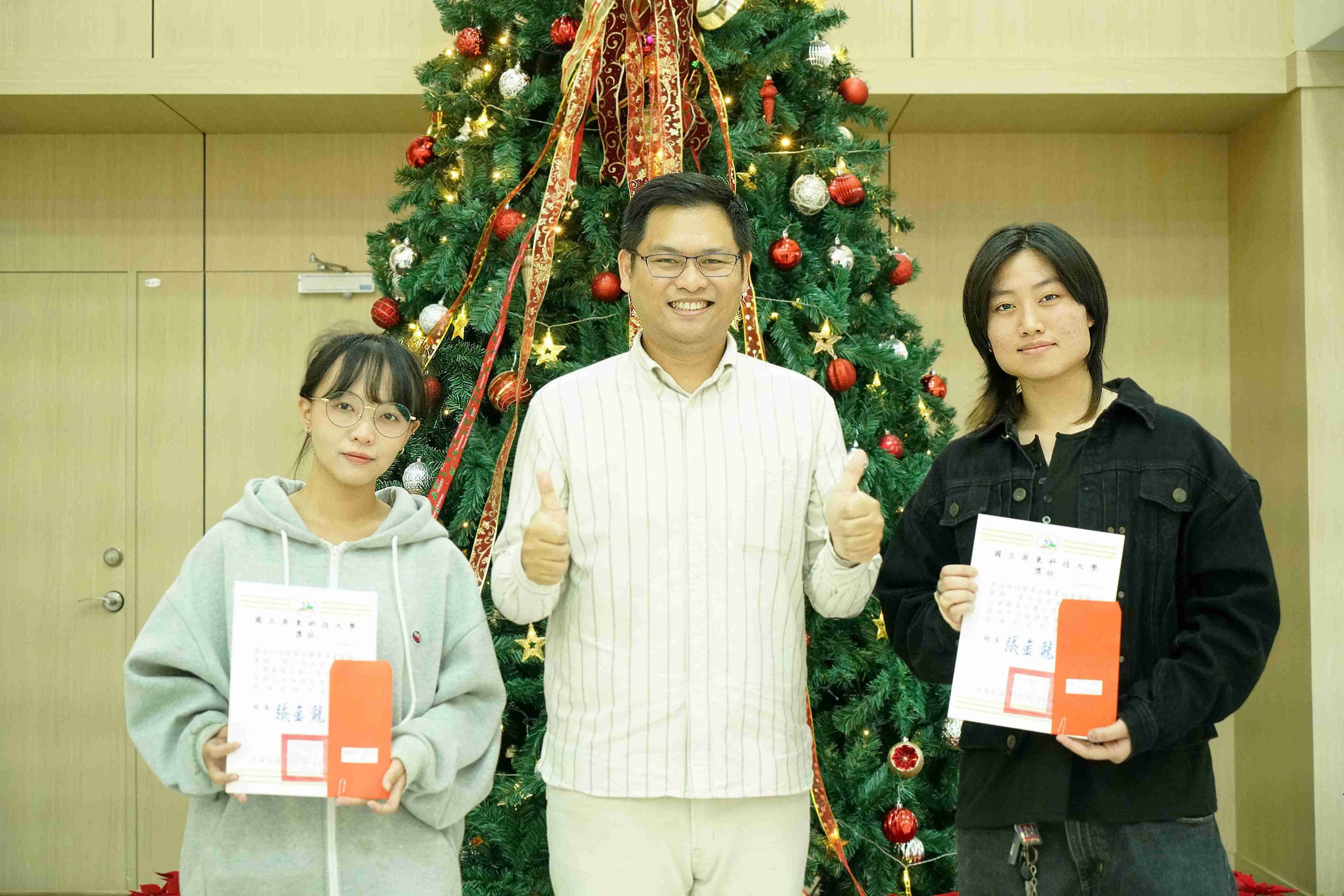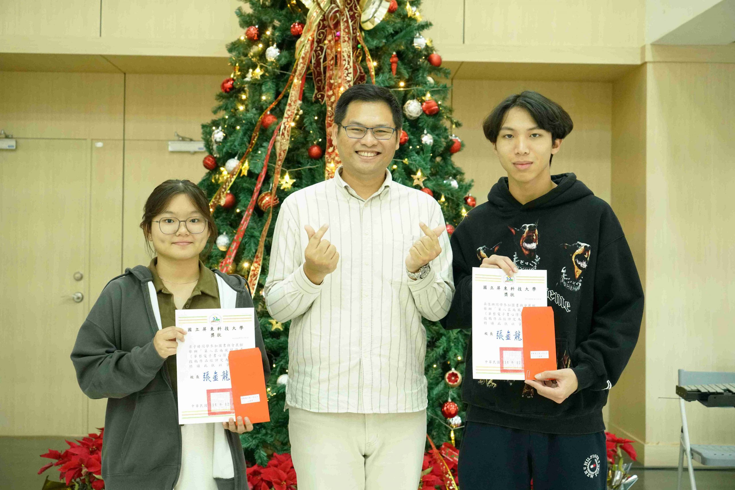 本校圖書與會展館(下稱圖書館)與通識教育中心多年來致力營造校園文學氣息,鼓勵學生將閱讀融入日常生活,連續七年共同舉辦「南風閱讀季」和「靜思湖文學季」,成功引導學子們養成閱讀習慣,進而激發書寫創作與分享。其中「華藝電子書心得分享」活動今(114)年邁入第八屆,共計1,094件投稿件數,創歷史新高,由本校國文組老師擔任評審委員,自910件有效稿件中評選出「入選獎」30名,以及最後階段「優勝獎」8名。頒獎典禮於昨(15)日15時40分於圖書館1樓會展大廳舉辦,並以「搖響鈴噹,點亮耶誕樹」點燈儀式為典禮揭開序幕。