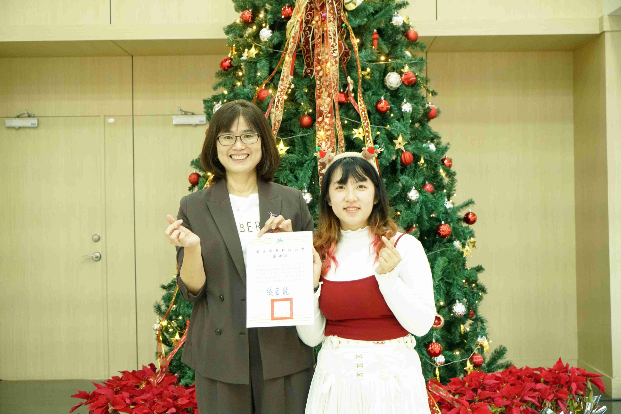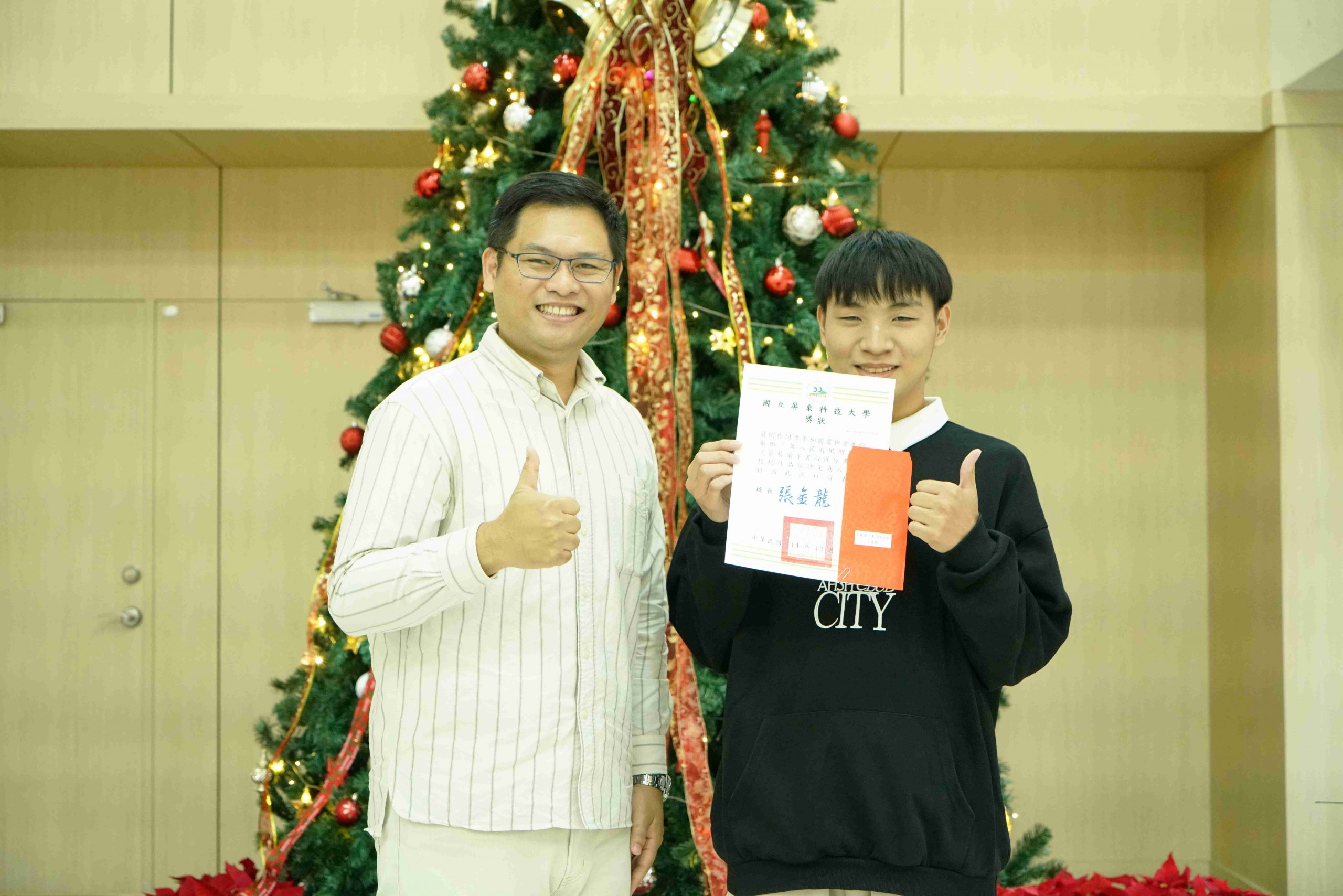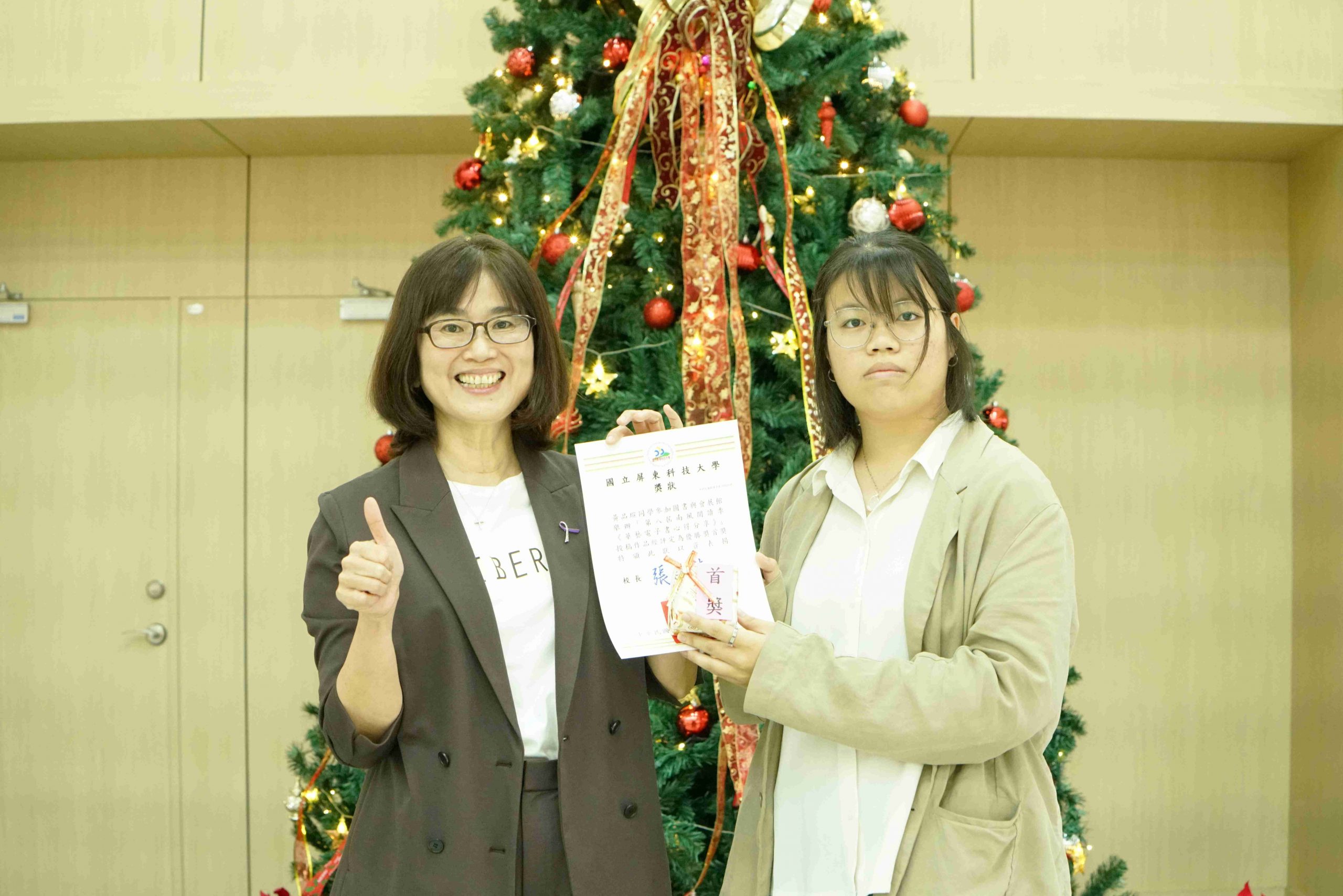 本校圖書與會展館(下稱圖書館)與通識教育中心多年來致力營造校園文學氣息,鼓勵學生將閱讀融入日常生活,連續七年共同舉辦「南風閱讀季」和「靜思湖文學季」,成功引導學子們養成閱讀習慣,進而激發書寫創作與分享。其中「華藝電子書心得分享」活動今(114)年邁入第八屆,共計1,094件投稿件數,創歷史新高,由本校國文組老師擔任評審委員,自910件有效稿件中評選出「入選獎」30名,以及最後階段「優勝獎」8名。頒獎典禮於昨(15)日15時40分於圖書館1樓會展大廳舉辦,並以「搖響鈴噹,點亮耶誕樹」點燈儀式為典禮揭開序幕。