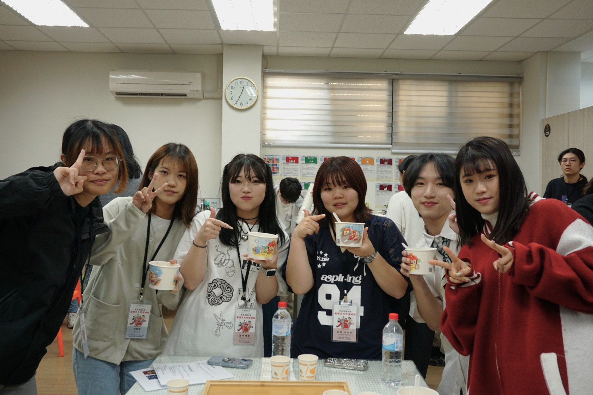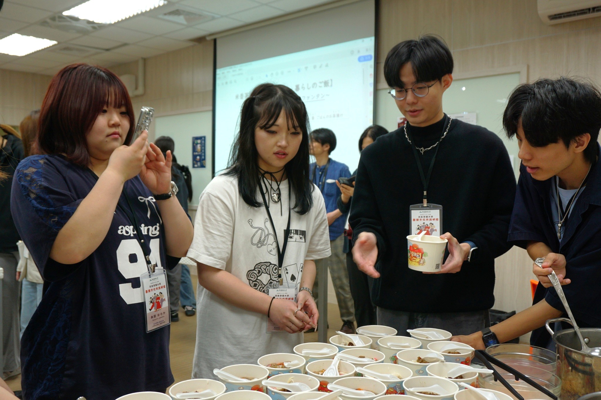 在幼兒教育交流方面,學員參訪竹田小學校及屏科大附設幼兒園,實地觀摩臺灣教學現場,並安排竹田驛園散策,感受在地人文風貌。於校內課程中,語言中心規劃「文化交流:米香茶話」活動,特別設計「奈良茶泡飯PK臺灣飯湯」交流體驗,邀請本校選修日語之臺灣學生共同參與,透過飲食文化開啟對話,現場互動熱絡,氣氛融洽,展現臺日學生交流的活力與創意。此外,課程亦包含中文學習及「臺日文化差異與交流」專題,協助日本學生更深入理解臺灣社會文化。