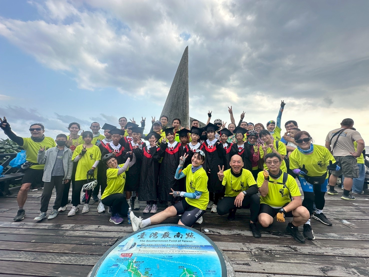 活動於上週六(3/21)清晨4時30分由屏科大師生、同仁及校友等16名團隊人員,在體育館集合整備,隨後前往榮華國小;5時30分與榮華國小師生及家長會合後出發;其後,建國國小、溪北國小及賽嘉國小於沿途陸續加入隊伍,超過160位大小朋友,集結迎風前行,途經內埔、潮州、新埤、枋寮、楓港、車城、恆春,最終抵達位於恆春鎮北緯21°53′ 59”,東經 120°50′ 0”的臺灣本島最南點。團隊站在令人震撼的太平洋與巴士海峽交界地,除深感這趟單車挑戰旅程超越自我,也象徵大學專業能量、地方教育陪伴與在地族群文化間深刻且動人的交融。