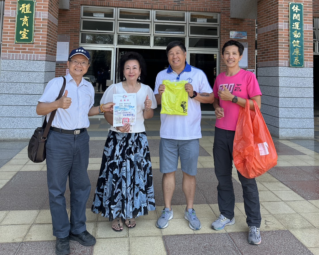 此外,考量長距離騎乘面對上下坡路段、逆風與體力分配等考驗,團隊亦於行前陪伴學童實地練騎,協助學童熟悉不同路況下的騎乘節奏,強化體能及穩定度。出發前,由陳敏弘主任偕同鐵人三項田偉璋教練,致贈四所國小師生自行車專用水壺及運動員專用營養品,讓孩子們在途中補充能量;屏科大的行政同仁亦熱情投入前期聯繫及物資整備;休運系四位具自行車專長的學生選手在途中即時關心學童狀況、適時鼓勵、陪同騎乘,成為孩子們最直接的榜樣。