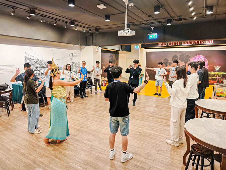 營隊除專業課程外,也精心安排多元文化體驗活動,包括參訪玉佛寺與大皇宮、昭披耶河遊船、傳統市場探索及博物館導覽等,讓學生深入體驗泰國歷史文化與在地生活。此外,課程中亦融入泰國民族舞蹈練習與基礎泰語教學,讓學生透過肢體律動與語言學習,實際感受文化內涵,提升跨文化理解與溝通能力。透過穿著傳統服飾、品嚐街頭美食及參與互動展覽,學生不僅感受文化差異,也在交流中建立尊重與理解,培養全球公民素養。多場團隊活動與工作坊更促進雙方學生密切互動,於合作與對話中建立跨國友誼,強化文化連結。