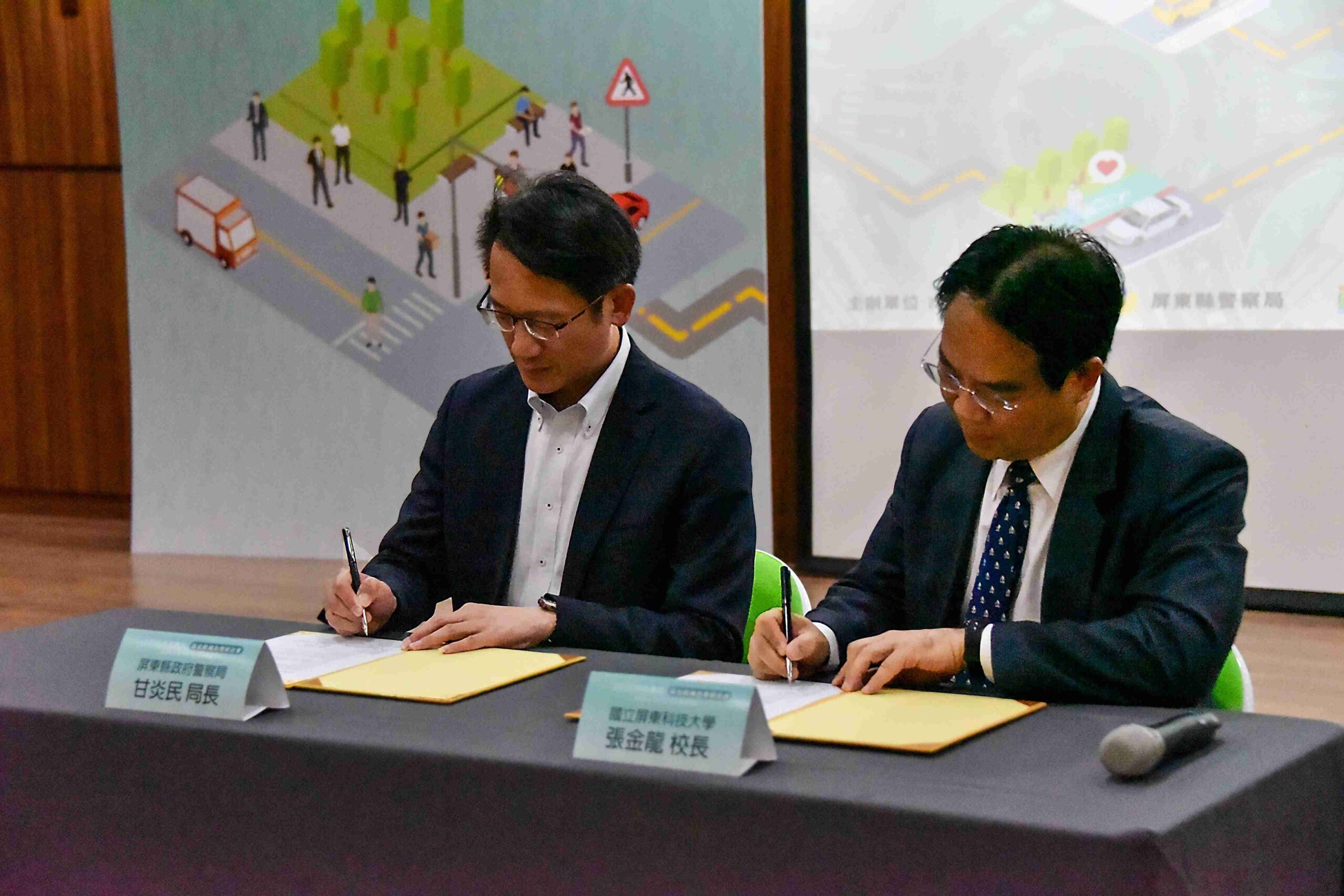 國立屏東科技大學(下稱屏科大)今(23)日下午2時於校園人文講堂與屏東縣政府警察局(下稱縣警局)簽署交通安全合作備忘錄,由屏科大校長張金龍及縣警局局長甘炎民代表簽署。雙方將針對交通安全專題教育課程規劃及提供產業實習與工讀機會等範圍,進行深化合作。